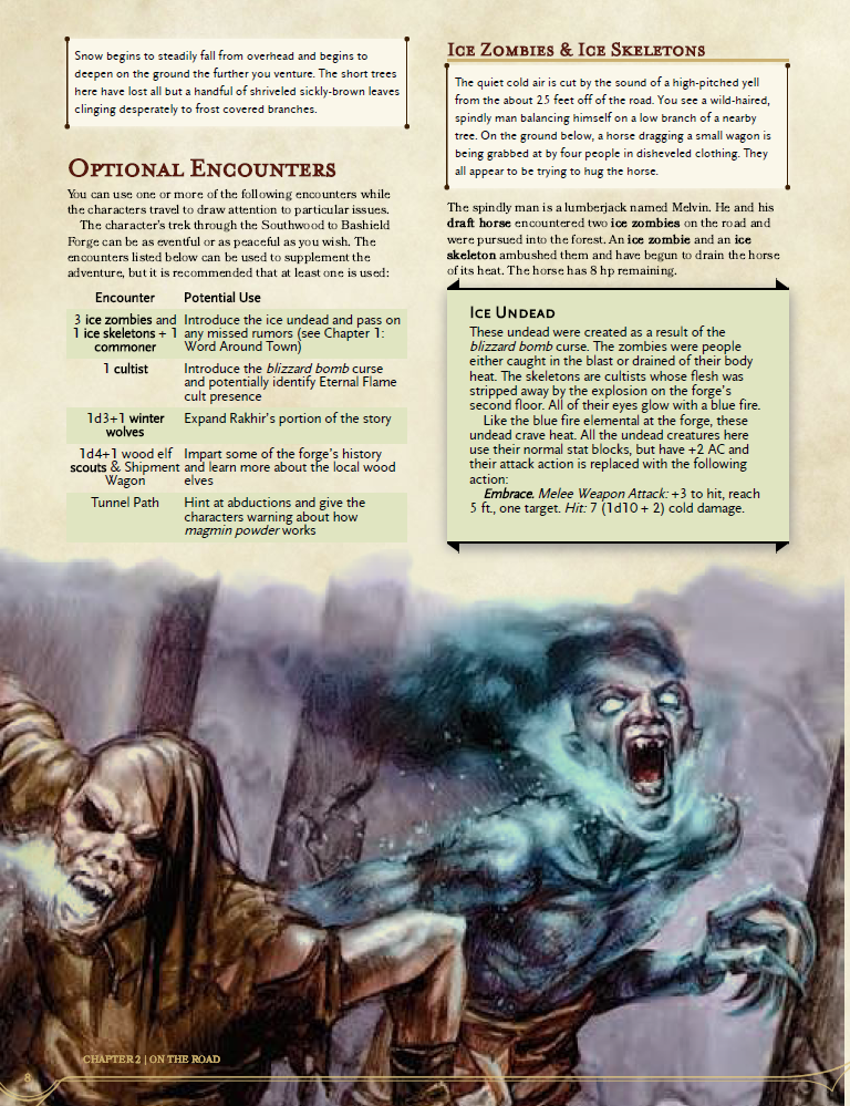 I was very impressed with how well-designed these encounters are, making all of them meaningful and impactful, such as discovering a surviving cultist with blue eyes who’s unable to warm herself (eventually throwing herself on the campfire should it get that far), and including several ice zombies that speak to the grisly fate of the missing shipment.