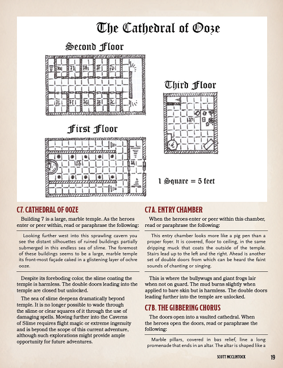 The PCs must carefully jump across pillars and walk across planks to avoid falling in, while battling oozes that can animate skeletons. The Cathedral of Ooze is a dungeon-within-a-dungeon, including a room of Gibbering Mouther trenches and a library with books of interesting lore about the ooze-worshiping cultists who once lived here.