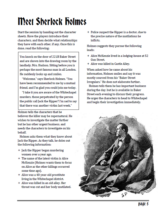 The short, 10-page adventure takes place in late 19th century London. Another grisly murder has taken place, and Jack the Ripper is still at large. The PCs are summoned to the infamous home of Sherlock Holmes at 221B Baker Street, given the basic murder investigation notes, and sent off to do some sleuthing.