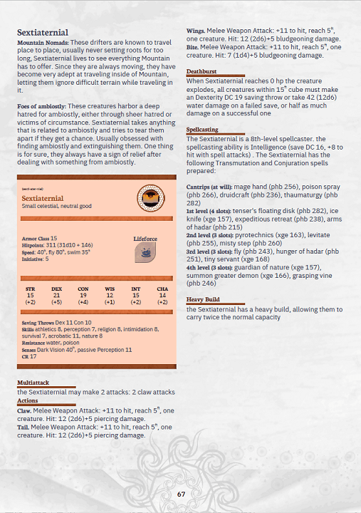 The Sexiaternial, for example, is a CR 17 celestial with fly and swim speeds, but the description says they are nomads who live in “Mountain” and ignore difficult terrain while living in “Mountain.” They are the sworn foes of “Ambiostly” and hate them for some reason. There are only so many descriptive paragraphs, and all of them contain very obvious variables that allows the generator to replace keywords with other words from a table.