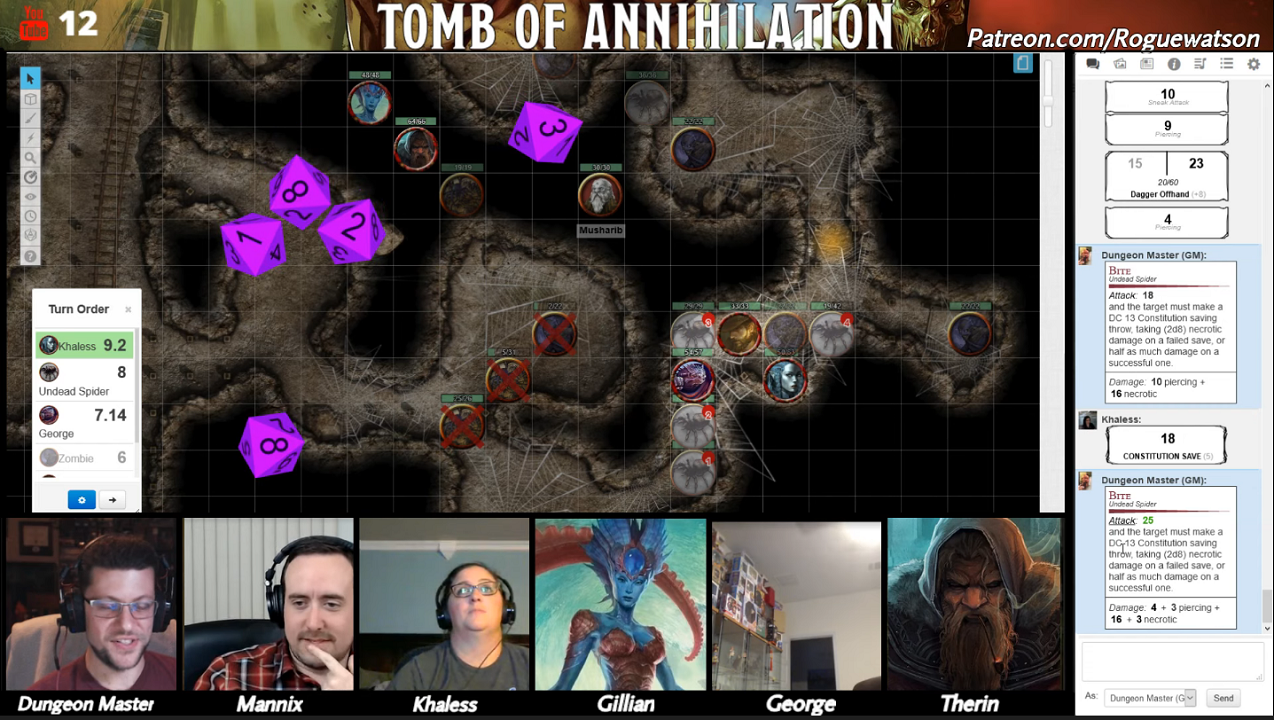 It was left to Khaless, Mannix, and George as they very carefully made their way through the webs. Khaless used her Charm of Movement from all the way back in Orolunga to give her the Freedom of Movement spell, essentially negating the webs. I used the Dungeon Master’s Guide for webs, forcing the others to roll DEX saving throws or be restrained. Poor George failed every time.