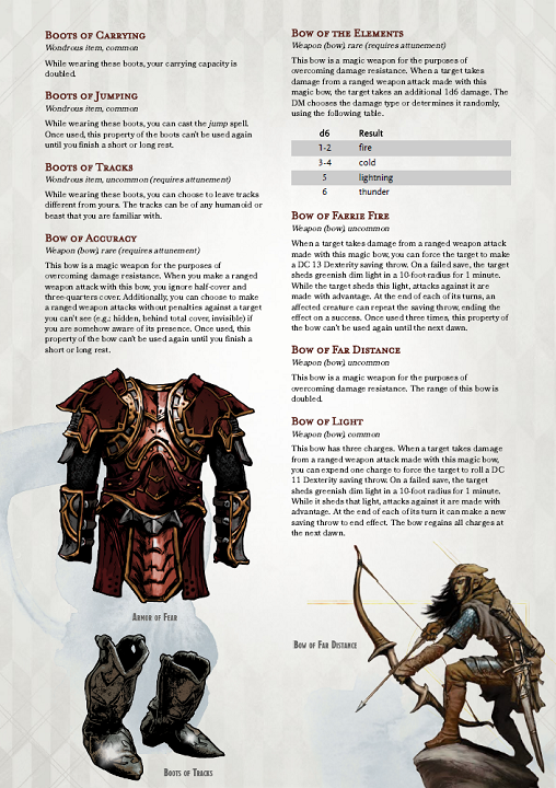 I also question the balance in some of the items’ rarity. Very few items in the Player’s Handbook are rated at the common level. More were added in Xanathar’s Guide to Everything, declaring that common magic items are mostly there for flavor, like a cloak that billows even without wind. But here I’m seeing common potions that grant levitation, Freedom of Movement, darkvision, or boost a stat to 18 for 1 minute.