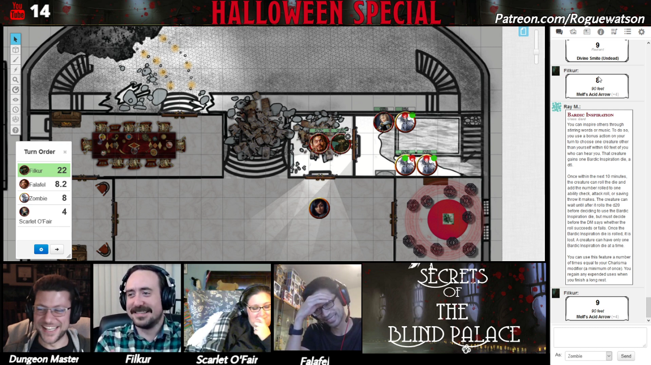 From there Falafel was able to use his last healing potion on Filkur and cast Healing Word on Scarlet, and suddenly the whole party was back in action! It may feel a bit cheap, and I technically didn’t roll a save at all for Katherine (I actually forgot to add her sheet into Roll20, but she was a non-combatant this whole time anyway. Even if she failed the save, she would have survived).