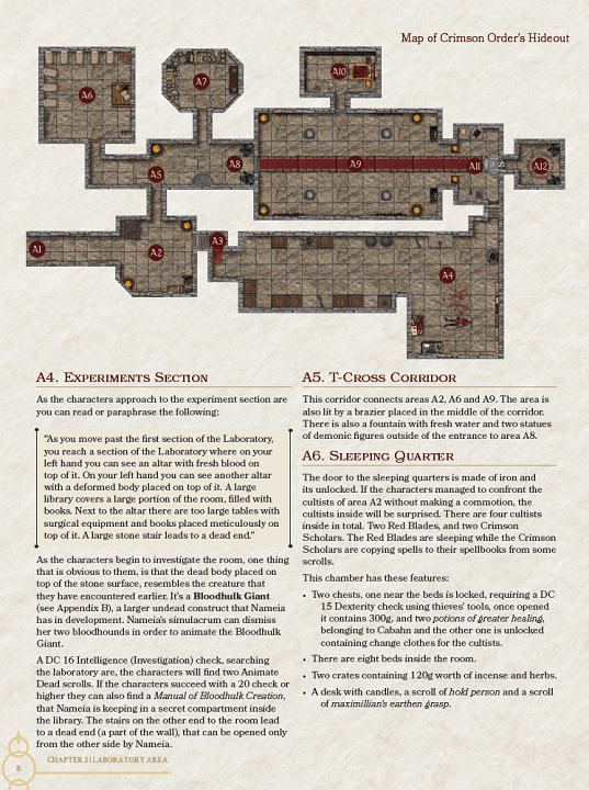 Nameia’s Laboratory is a short dungeon crawl through a cultist den ruled by a blood mage, the titular Nameia, for 6th level parties.