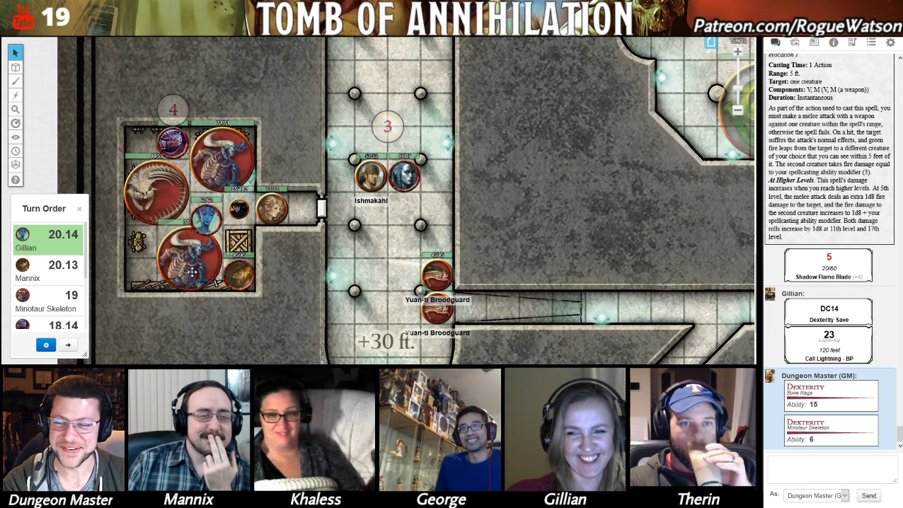 I rolled so badly on my attacks that I only hit once, and she rocked the CON save to maintain concentration. Meanwhile the Bone Naga is a spellcaster. I had it use Stinking Cloud, but Therin nailed the CON save and used Dispel Magic in response. We did that song and dance twice before the Bone Naga and the skeletons were slain due to the repeated lightning bolts, George’s flurry of sword blows (his first attack was a crit!) and Xandala’s cantrips.