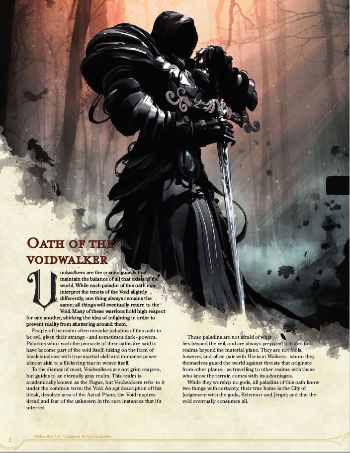 As a Sacred Oath, the Paladin Voidwalker includes its own tenants, new Channel Divinity Options, and several new abilities.