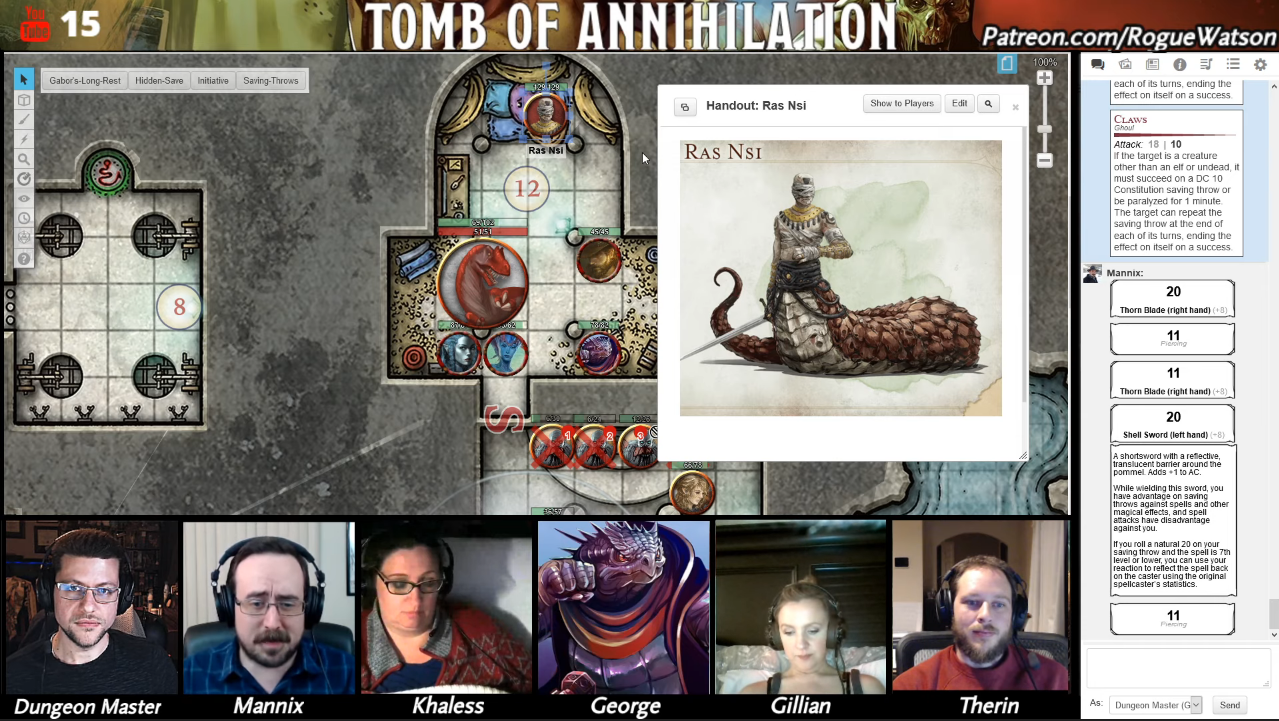 Using her bagpipes with that spell Gillian can impose disadvantage, negating the Yuan-ti magic resistance. Every single one of them failed. Sekelok has a twice-per-day ability to reroll a saving throw – and he failed again. Everyone in the throne room was either downed (Salida) or incapacitated for 1 minute. The PCs knew about the ghouls hiding behind the throne room, but they were only activated by either Sekelok or the secret door opening.