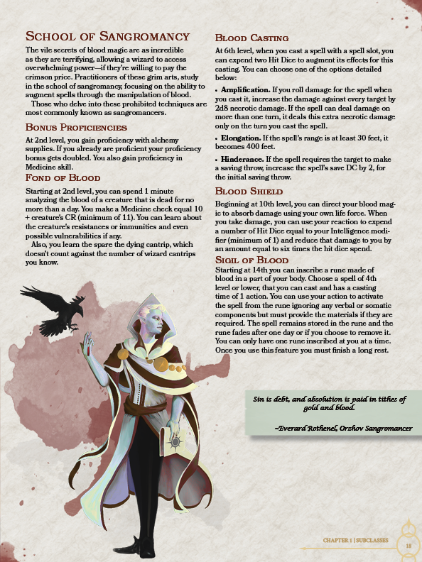 Chapter one covers 12 new subclasses, one for each class. It’s a stark reminder that not every class fits every theme. The Pact of the Blood Mark turns the Warlock into a pseudo-vampire, along with some unique invocations, while the Monk’s Way of the Crimson Blade allows them to conjure blood blades with lots of nifty features. My favorite is the inventive College of Blood Painting, turning a bard into something out of Castlevania or Final Fantasy.