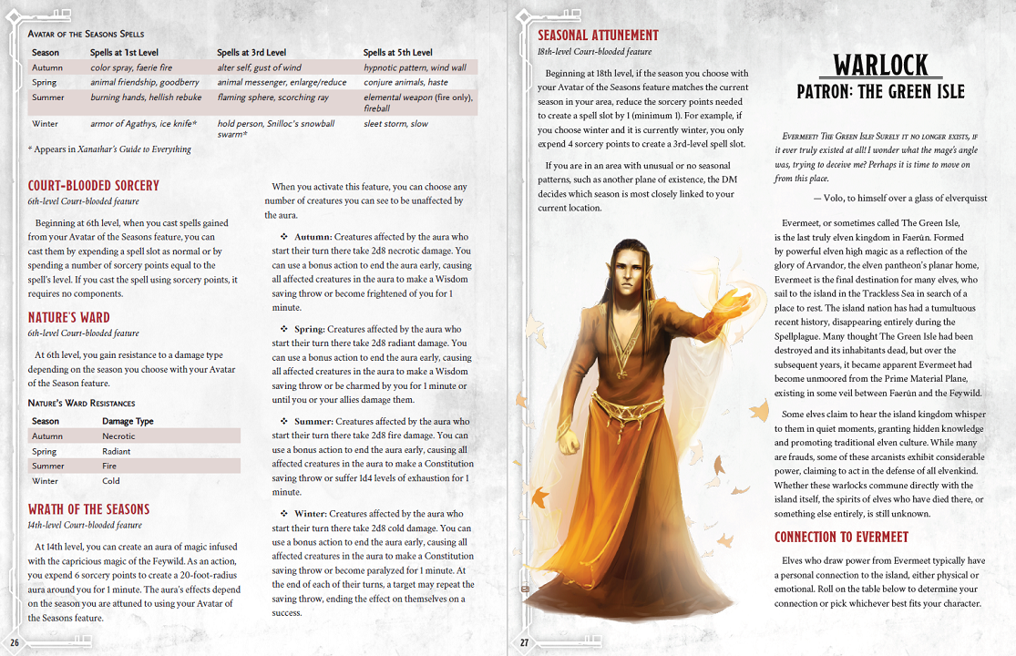 Those three subclasses alone are some of the best I’ve seen from the DMs Guild. Of the two products I prefer Dwarvish Archetypes overall, but Elvish Archetypes has plenty of fun new additions, like the Druid Treesinger (awakened tree ally and plant wild shapes), Verdant Path Monk (create magic herbs, nature powers), and Court-Blooded Sorcerer, which can choose one of four different seasons after each Long Rest, gaining new spells and abilities.