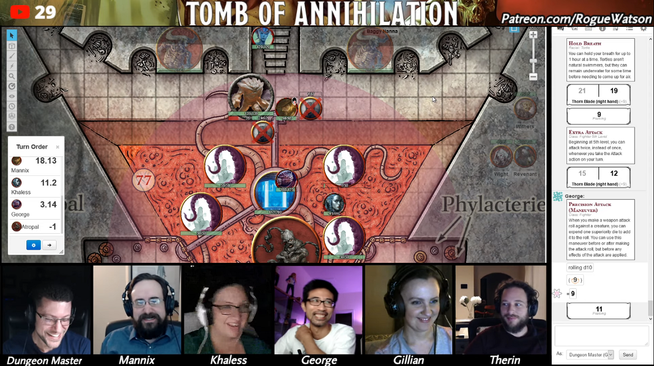 Acererak is furious and casts Disintegrate on Therin, who fails the save. He’s dusted! Except his god keeps him alive, same as George (and Gillian). The DM is merciful (and may have over-tuned this fight a bit).