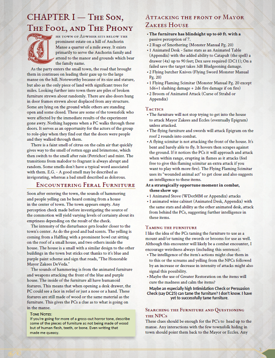 The adventure focuses more on immersion, mood, and story-telling than a traditional dungeon crawl. Each room of the mansion features a unique scene from a different realm for the party to deal with, such as the vampire mother wanting to save her child from a magical deathtrap in the Shadowfell dining room, a pit fiend looking to make a deal in the Nine Hells game room, and a magnetized lab partially invaded by the realm of Mechanus.
