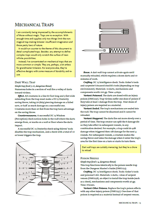 Each trap is given extensive details that include potential countermeasures, special effects, crafting rules (including materials), and optional variants. Countermeasures for the Poison Gas trap, for example, include noticing ventilation holes with a Perception check, using thieves’ tools to disable the mechanism, and/or blocking the holes to stifle the gas. Optional variants include replacing the poison with smoke, or using Dust of Sneezing and Choking.