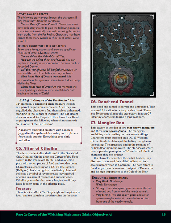 The Verdict: The Heir of Orcus: Verse 4 provides a straight-forward but well-designed Adventurer’s League dungeon crawl in a richly themed cavern full of Cthulhu monstrosities and madness.
