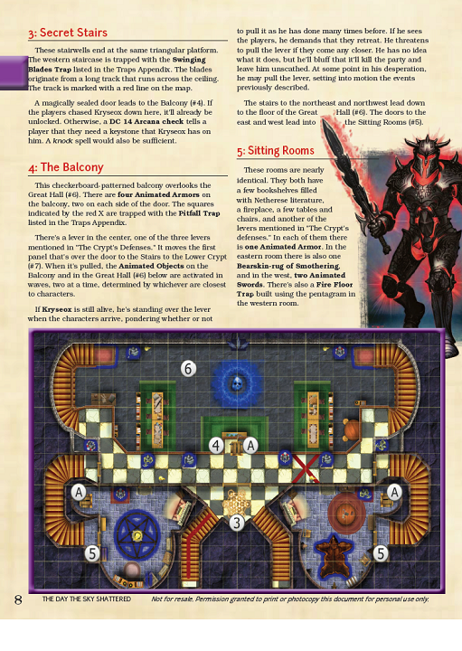 The adventure is well-organized, with an entire intro section that provides the story overview and adventure hook, as well as notes on the Netheril, Kryseox, and the crypt’s defenses.