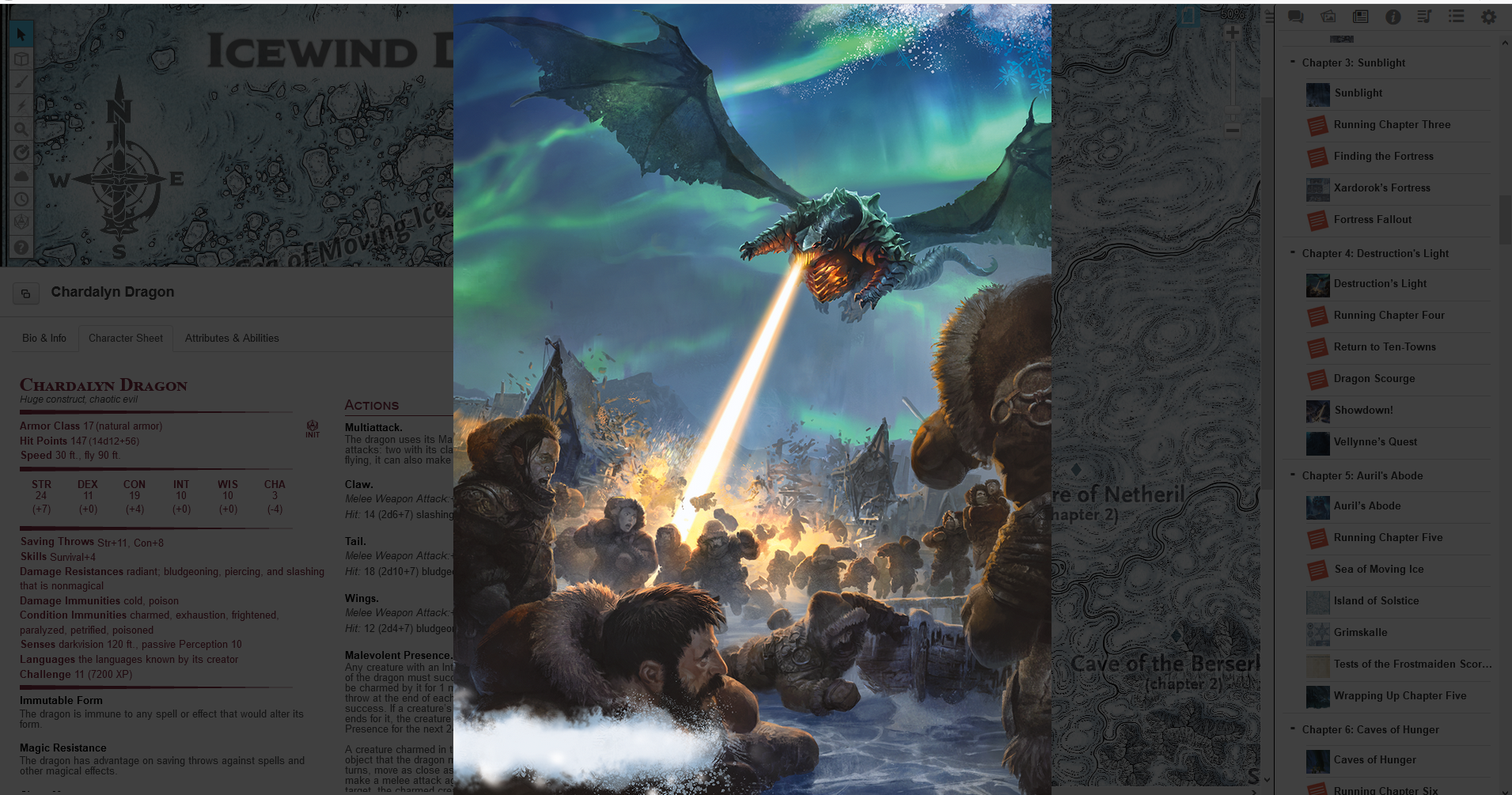 Thankfully Rime of the Frostmaiden is a triumphant return to detailed, full color battle maps. Huzzah! Don’t expect a lot of color or variety in a winter-locked region – it’s mostly caves and forts, but the maps are a huge step up from recent D&D 5e campaign books, and look great in Roll20. The one flaw: half the dungeons are drawn in 10-ft scale, leading to 5-ft subdivisions and the need to zoom in on tiny tokens.