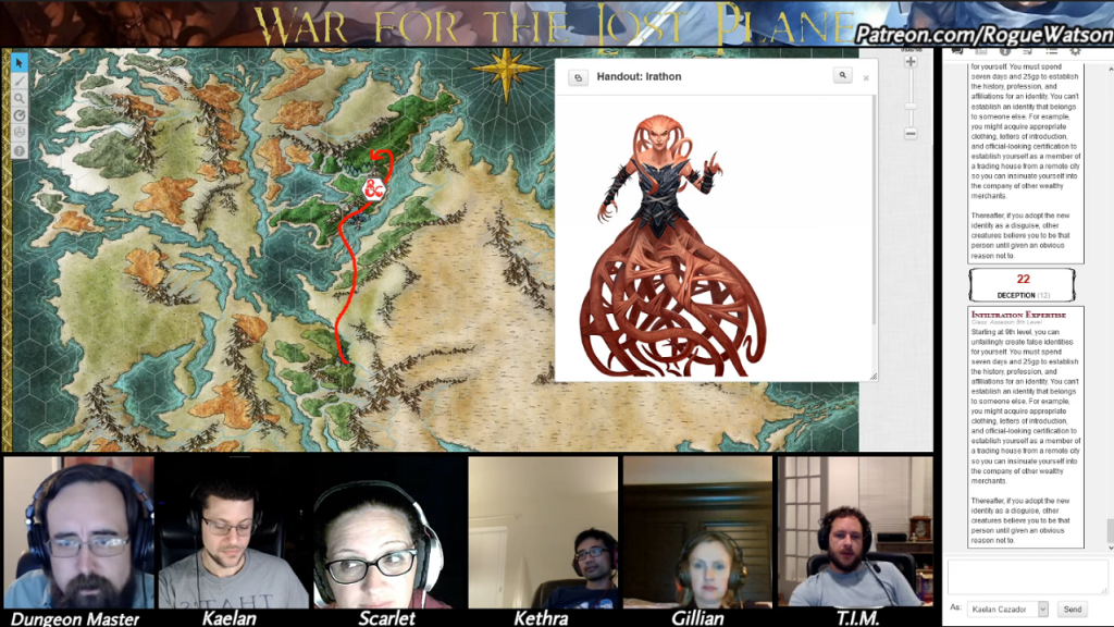 The next day we continued traveling through the One Wood, turning a corner to find a hovering figure. A red humanoid, female, with writhing tentacles in the lower half of her body. We froze, and she calmly introduced herself as Irathon.