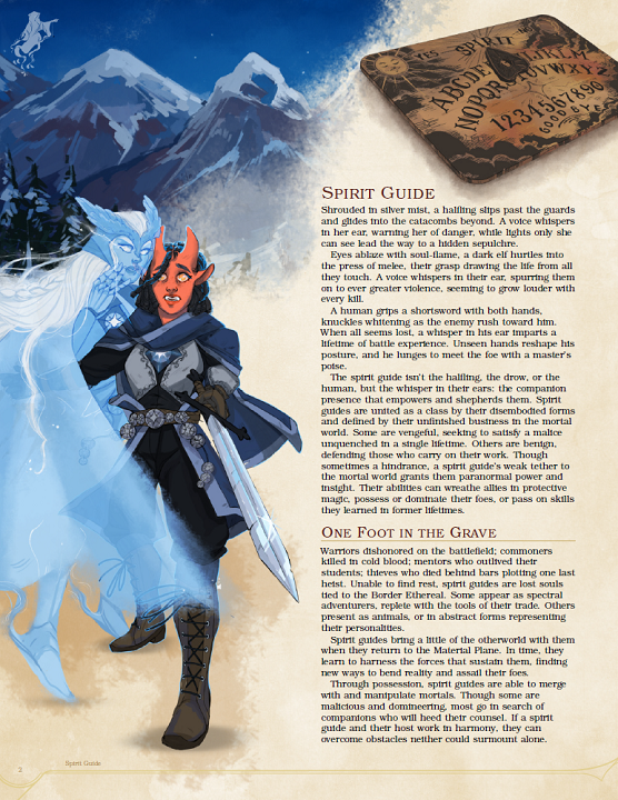 The spirit guide is a unique ghost class who cannot attack, cast spells, or interact with objects, though can be targeted by enemies and traps, with their paltry d4 hit die. On the flip side they have resistance to nonmagical attacks, immunity to most conditions, and are immune to falling damage, though they can’t fly (and aren’t incorporeal) until 15th level.