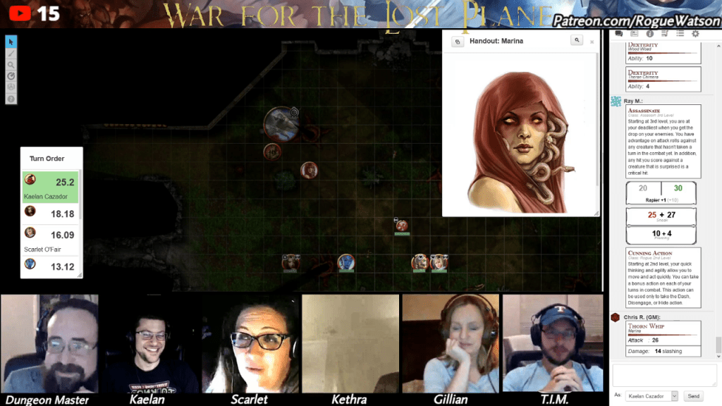 Our poor DM rolled poorly on initiative for all the enemies, leaving Kaelan to open with a 35 damage Fireball (everyone fails) and Kethra to land an assassinate Crit on Marina, dealing 60 damage! In only two turns we dealt nearly 100 damage to the boss of Marin’s Grove.