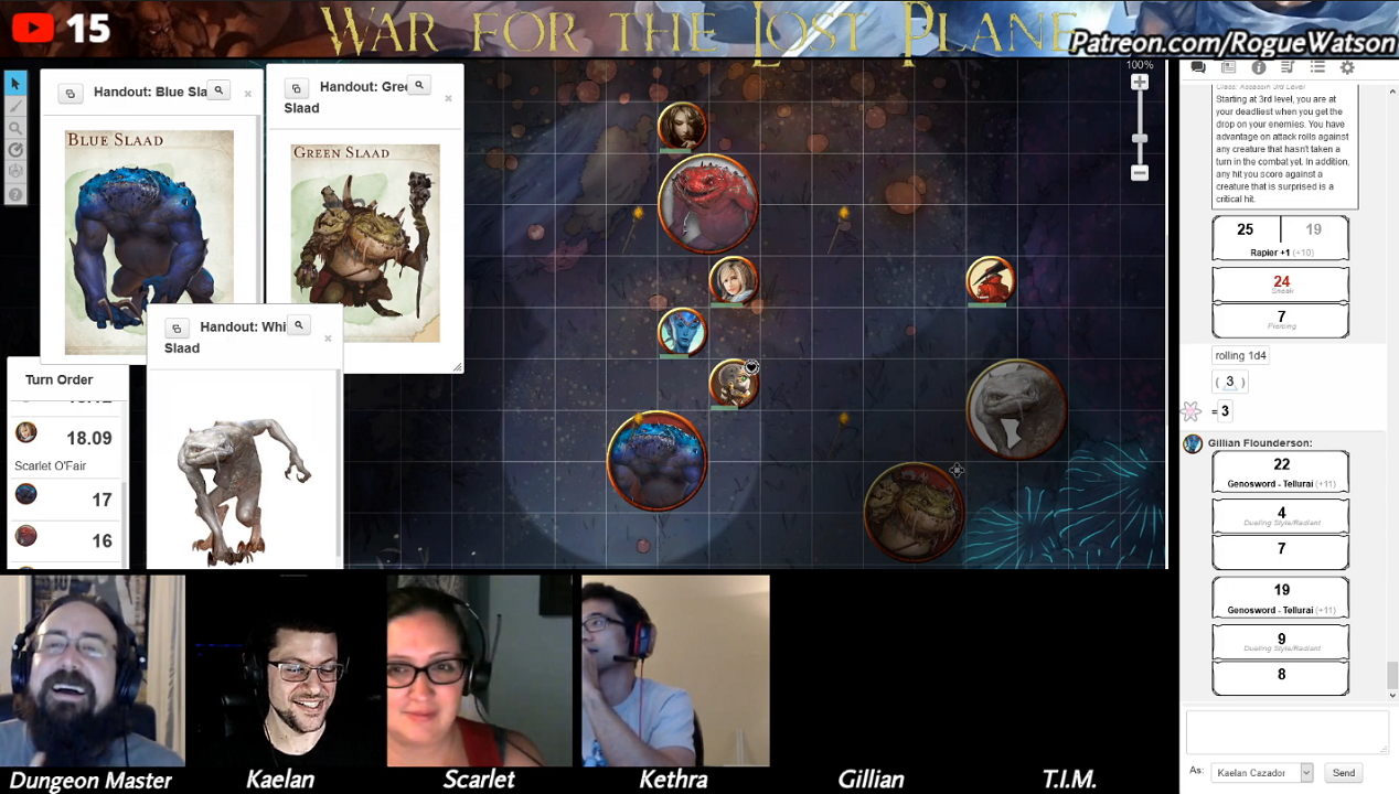 A staff-wielding green slaad attempt to blast the party with Fear, but the magical effect simply washed over Scarlet’s free-immune aura. A white slaad materialized from invisibility to cast a spell, but Kaelan shut it down with Counterspell.