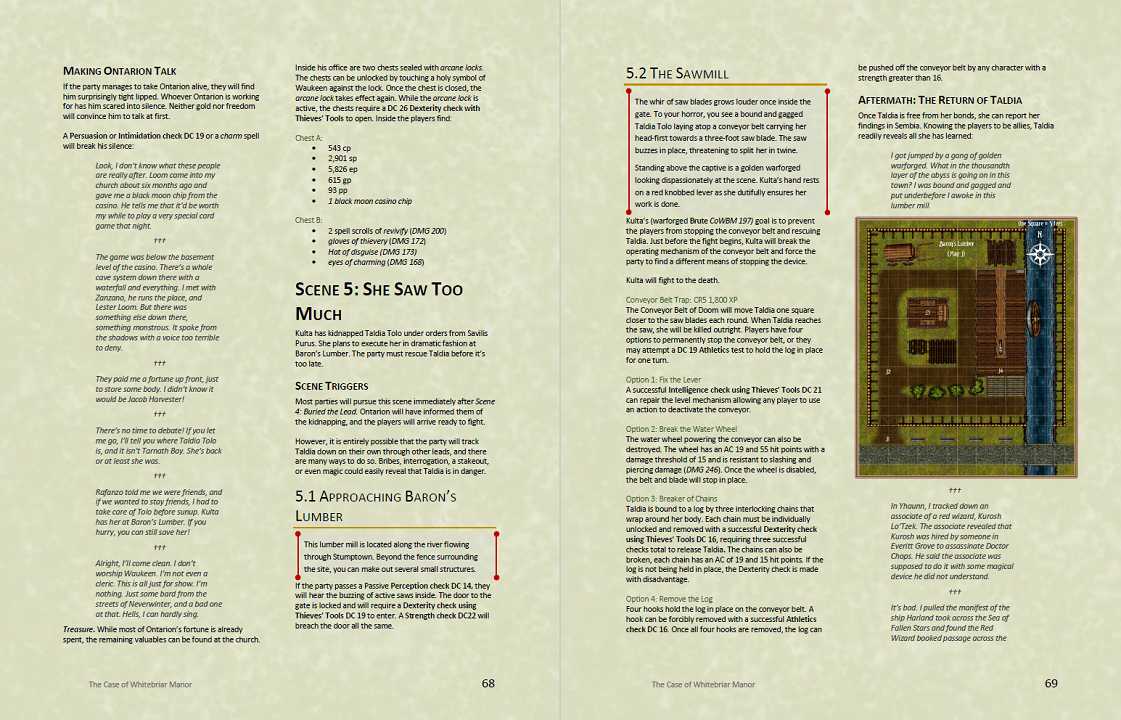 Each act includes important plot beats that the party should experience before moving on, such as discovering the involvement of the crime syndicate, leading to a climactic assault on the casino in act two, which harbors the lair of the murderer – a black dragon!