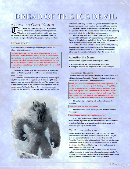 The adventure kicks off as the party arrives in Cear-Konig in the Ten Towns region of Icewind Dale. No adventure hooks are provided to get them there, but right in the middle of town is a rampaging Abominable Yeti with a Gibbering Mouther parasitically attached to its back.