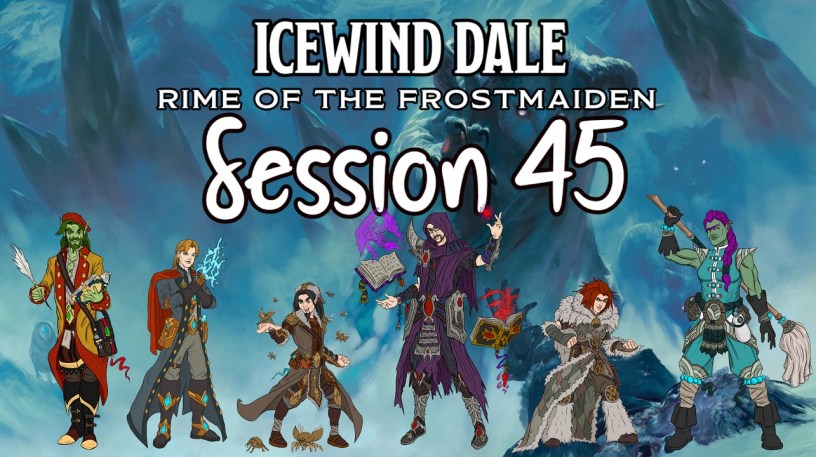 Crossing the sea of ice floes requires a few Athletics and Acrobatics checks. Edmond and Valravn fall in the frigid water, but Valravn has his Ring of Warmth to prevent exhaustion, while Edmond makes the CON saving throw before Fray fishes them out. Edmond casts Flaming Sphere to help dry them off.
