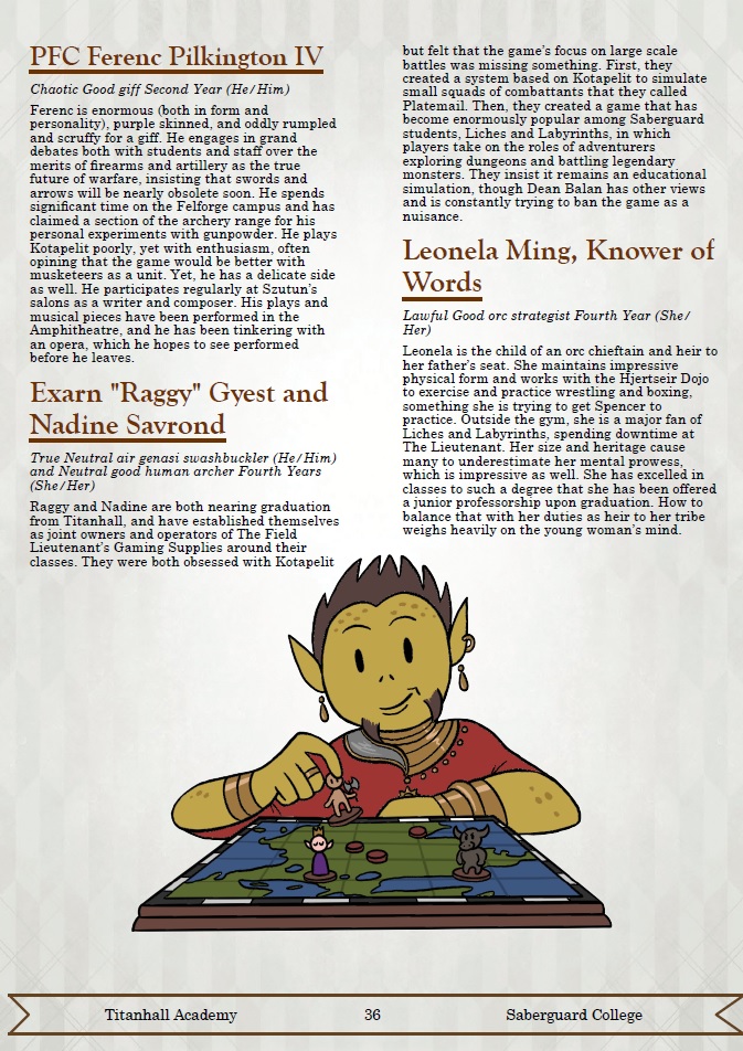 The excellent assortment of NPCs is the strongest element of the sourcebook, from the dragon dean of Memnor (and his rebellious half-dragon son!) to the minotaur weapon master of Hjertseir who scoffs at his own school’s spirituality nonsense. Not to mention all the student drama.