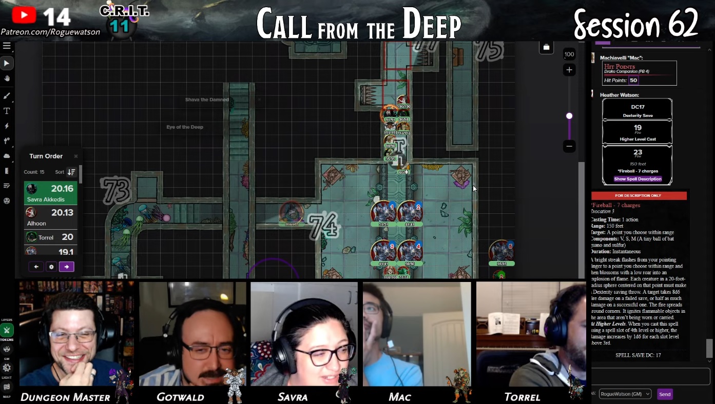 Gotwald and Mac swim into the enemy backline to take down the sahuagin priestesses. They’ve failed to paralyze party members, and switch to spirit guardians for damage.