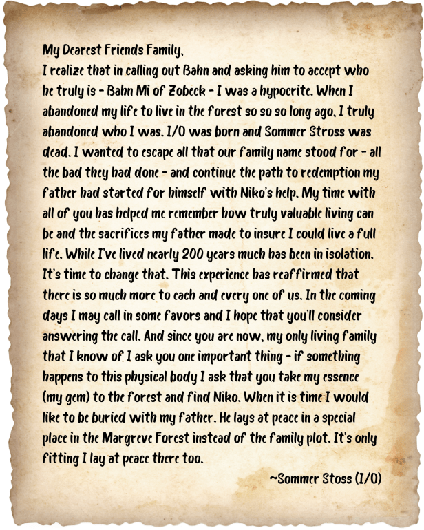 I/O is quiet on the boat ride back. When they reach the Black Forest she slips a letter to her closest companions (who she now considers family) coming clean that in her human form she was Sommer Stross, a member of the family who ruled Zobeck with an iron fist and enslaved the kobolds before the citizens rose up and took control of the city. I/O returns to the Margreve Forest and spends about a year with Niko honing her druid and new cleric powers. When she returns to the city she calls in her favor to Bahn to help her develop a false identity and history – one that will allow her to reestablish and maintain her connection with her humanity. She is only referred to as I/O now by her closest friends. I/O travels with Lucian and Alaric to the ghoul-infested areas of Krakova in the hopes of studying and curing darakhul fever for good.