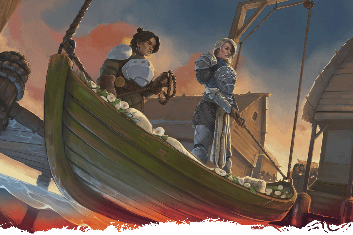 A few dozen townsfolk arrive at the wharf just outside the Brass Crab, including Mayor Raven, who says a few words, and spoiled young noble Bakaris, whose drunken belligerence puts him at odds with Elyas.