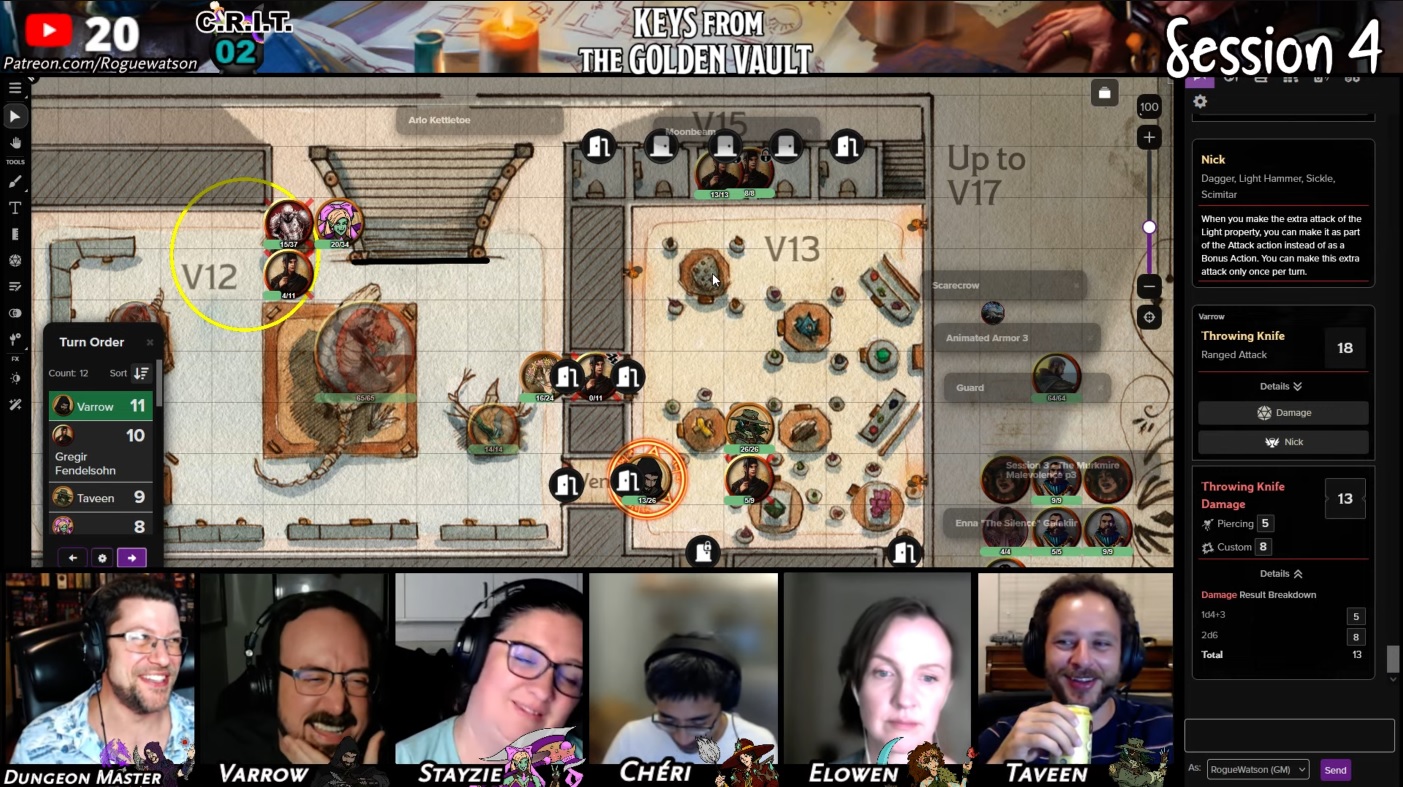 But the party already has their hands full. Elowen retreats and moves her moonbeam spell atop the guard and animated statue, destroying them both. Stayzie tanks some nasty blows, while Taveen tells her to get inside the gemstone wing and use the bag of holding with the stone.