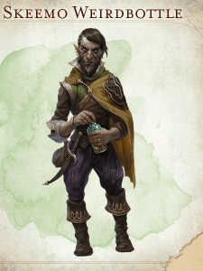 The man is Skeemo Weirdbottle, a shifty apothecary and mage. The party stuffs Elowen’s body into their bag of holding and moves across town to the Trade Ward, and into the pungent, cramped store.