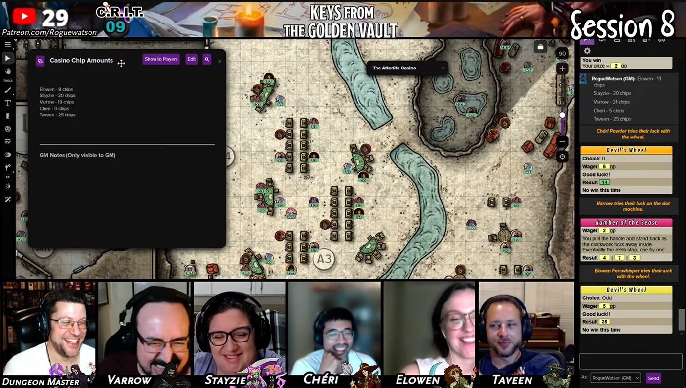 Each of the areas is themed after a different layer of hell, such as Avernus and Dis, and the party enjoys wandering around and playing with slot machines, roulette wheels, and card games.