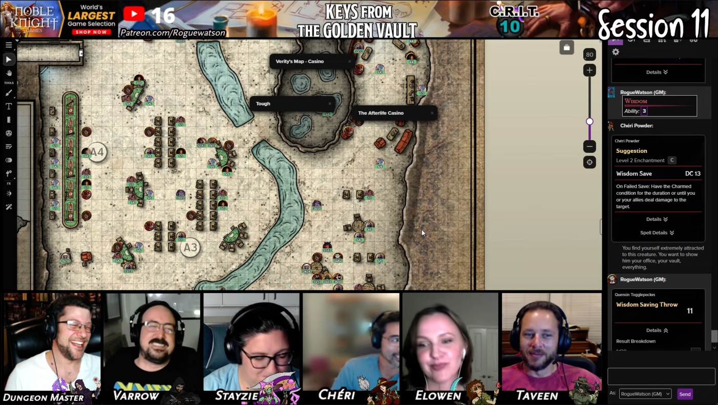 Elowen, still in croc form, shifts back to elf and dramatically crawls out of the river, acting drunk. Her performance calls the attention of a nearby guard, who escorts her to a chair and berates her about casino rules.