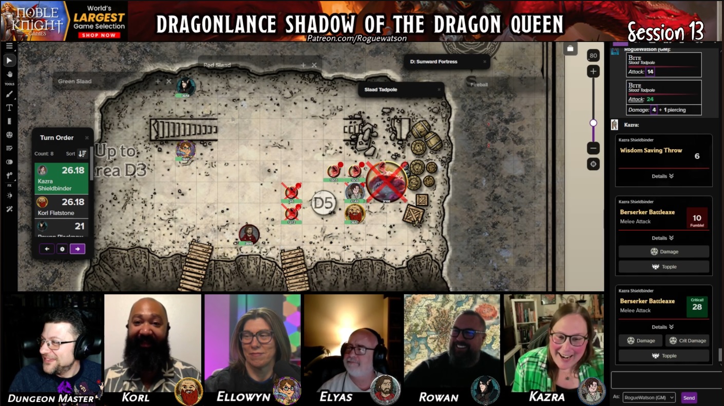 The party unleashes a huge wave of attacks, including a nasty critical hit from Rowan’s longbow, while Kazra tanks its claws.