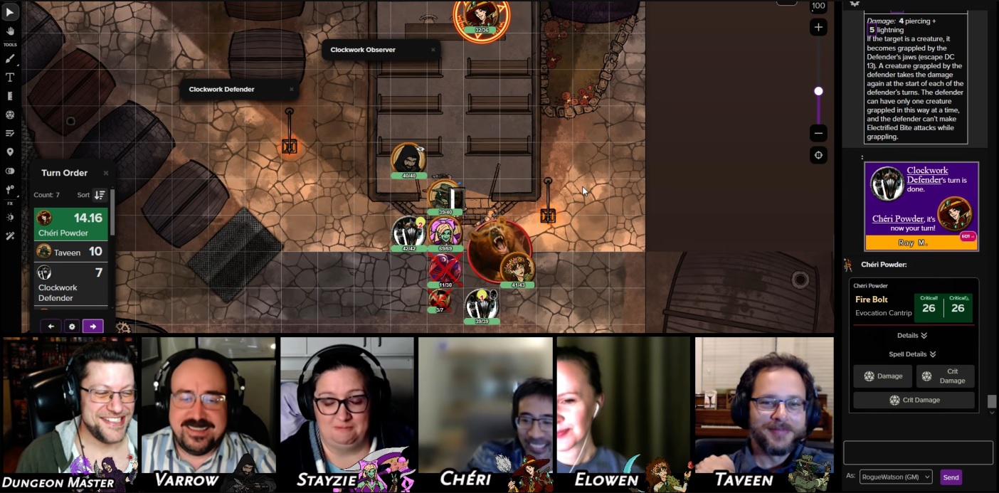 Things finally turn around when Chéri gets a critical hit on a firebolt cantrip, dealing 25 damage, followed by a four-attack blitz by Taveen (poor Stayzie continues to struggle, not liking the vibes of this dark place!).