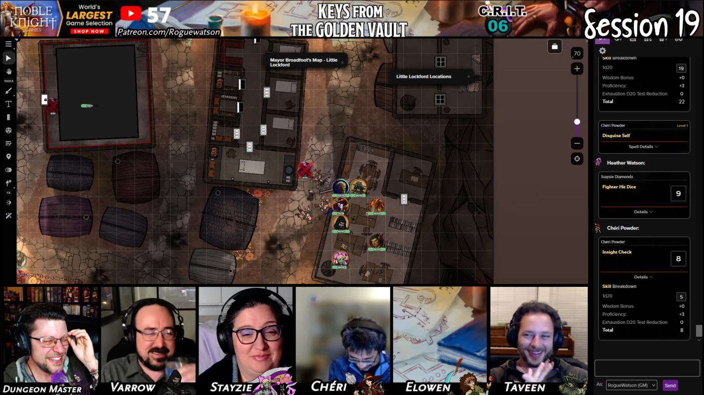 Chéri rolls an insight check to see if the can tell these guys aren’t enemies (but are growing very concerned). He succeeds, and turns off disguise self. Varrow helps play it off further, claiming Kavoda is also magically disguised, and Taveen starts fixing those drinks!